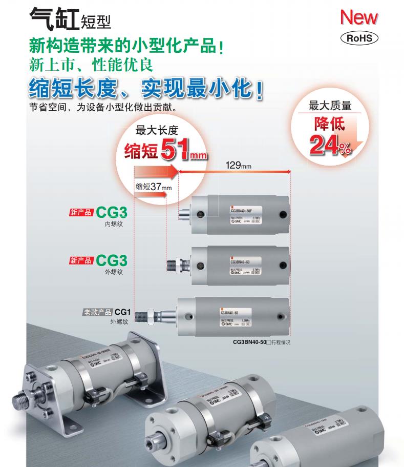 ・全长最多缩短51mm,质量最多减小24%(与CG1相比)。・杆前端内螺纹标准化。・带磁性开关(CDG3系列:CDG3)。