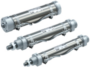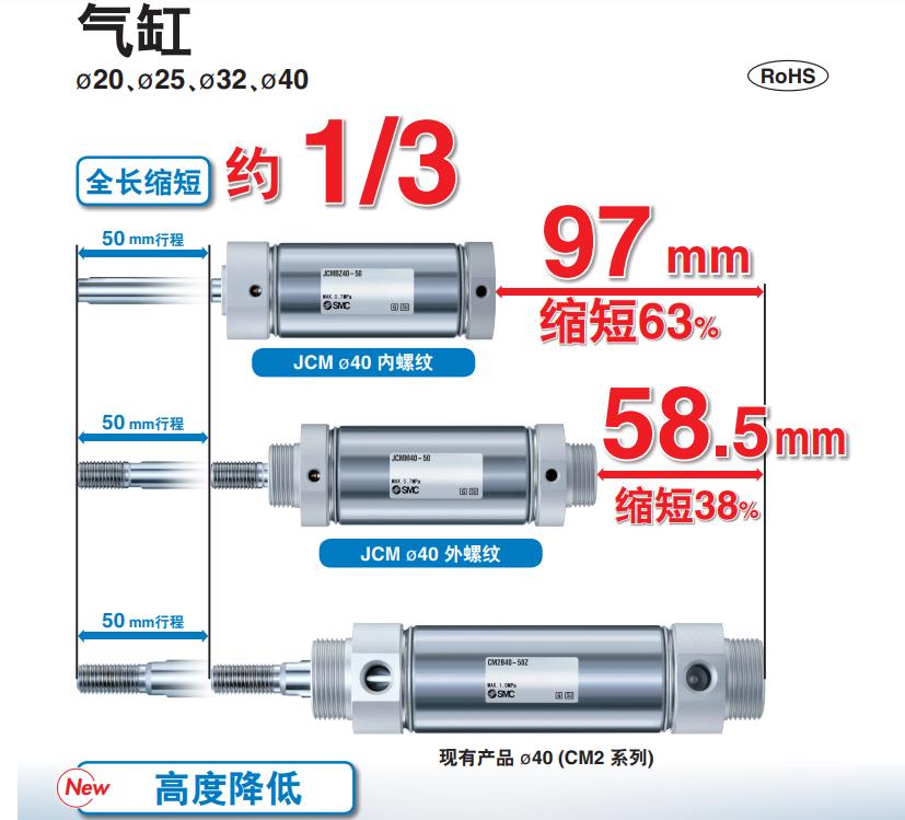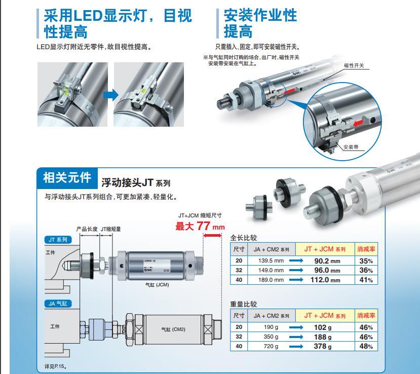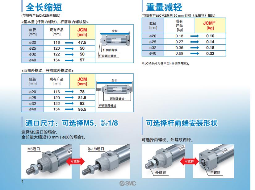 ・全长缩短 最多97mm・质量最多减少54%(0.69kg→0.32kg)・有多种缸盖形状可选。・通口尺寸:可选择M5, Rc, NPT1/8・杆前端安装形式可选・带磁性开关(JCDM系列:JCDM)