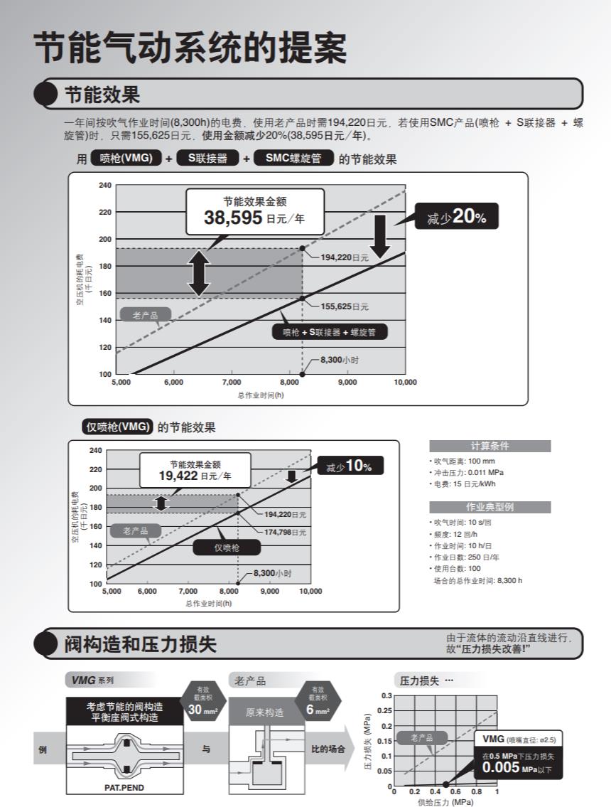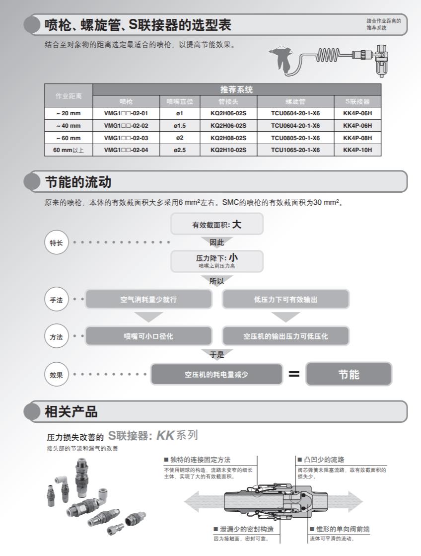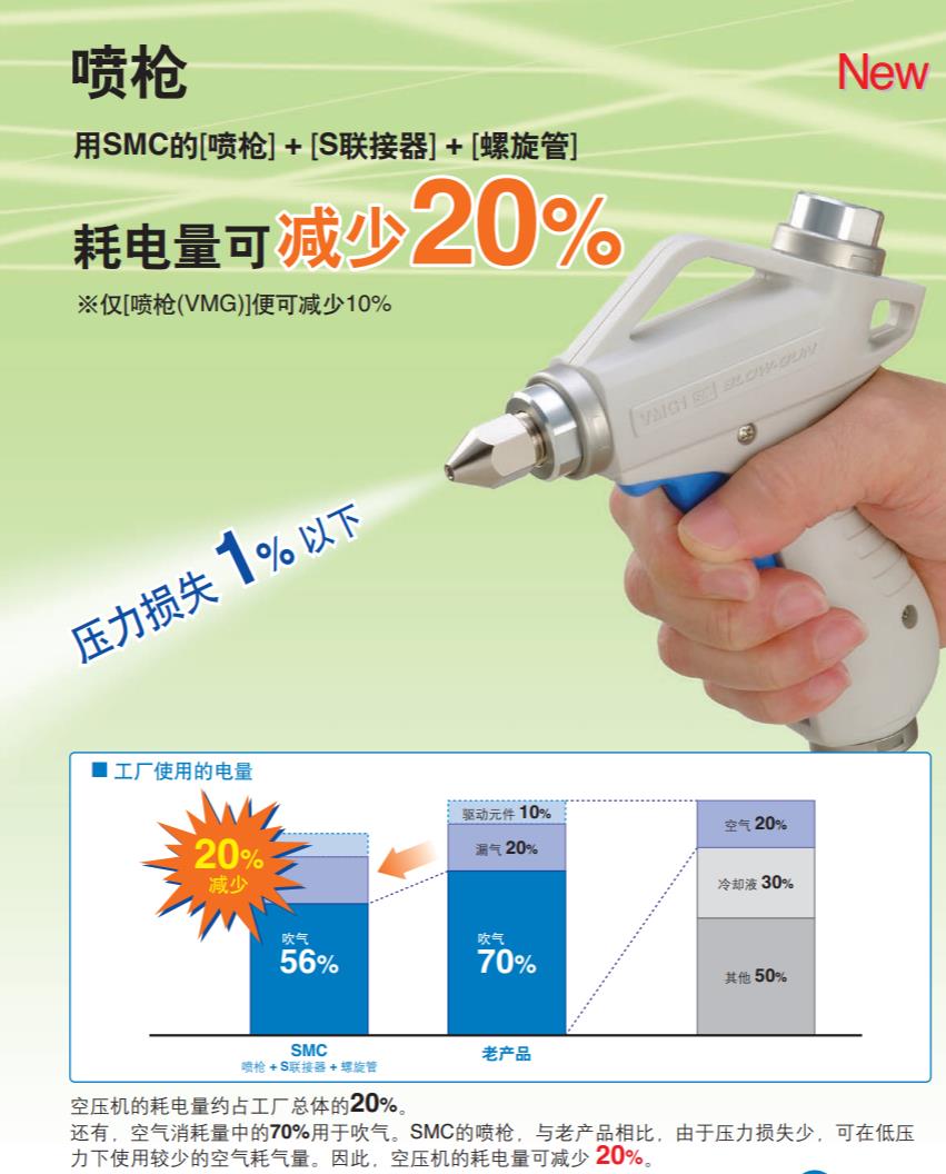 ・使用SMC的 [气枪]+[带单向阀的快换接头]+[螺旋管] 可减少20%功耗。 ・压力损失1%以下(喷嘴径:ø2.5) ・适用喷嘴 带外螺纹的喷嘴、带外螺纹的高效率喷嘴。 带外螺纹的低噪音喷嘴、铜管长喷嘴。
