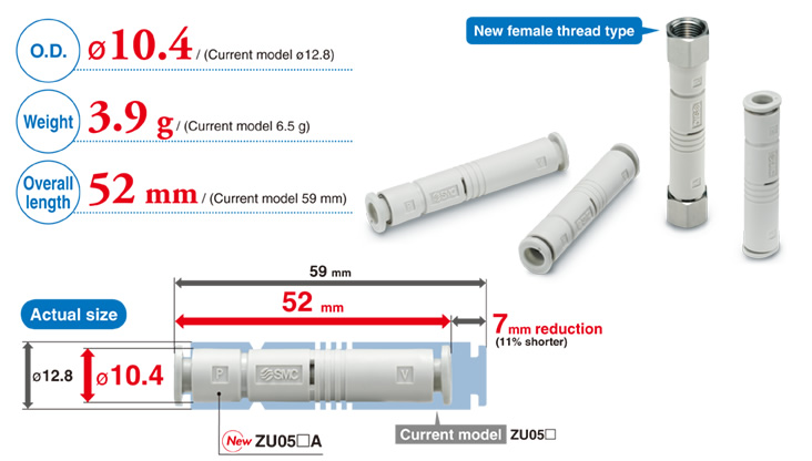 ・体积小、重量轻。 外形尺寸:ø10.4、重量:3.9g、全长:52mm・通口连接口径 ø6快换管接头、Rc1/8内螺纹。・到达真空压力(kPa) S型:-90。 L型:-48。