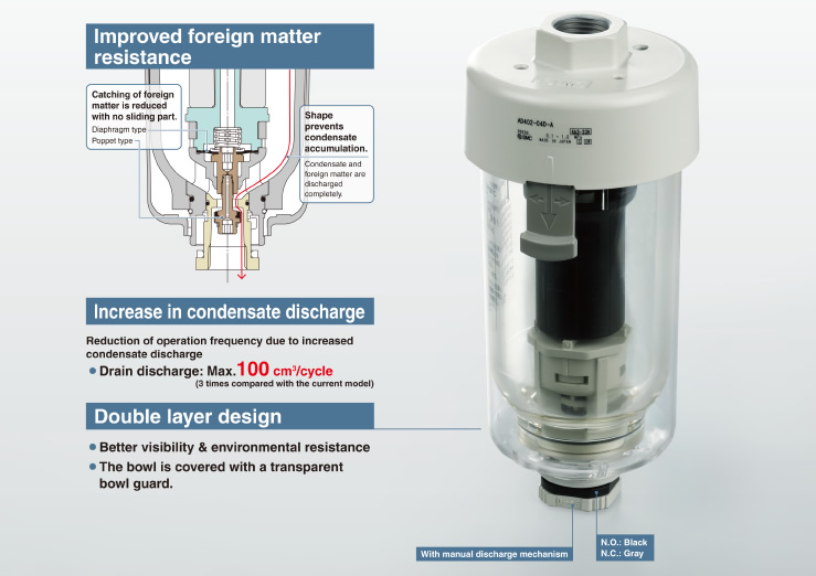 Windows on the bowl guard have been removed and the inner bowl is instead covered with a polycarbonate transparent bowl guard. Now, even if the environment changes and the bowl is exposed to corrosive chemical or oil splash, the foreign matter will not stick directly to the pressurized bowl. This can reduce risk of bowl breakage.