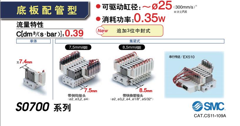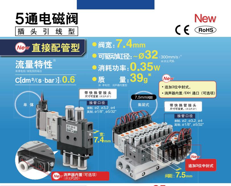 ・阀宽:7.4mm・气缸驱动尺寸:~ø32 (直接配管型)・消耗功率:0.35W・质量:39g (直接配管型)・集装型号:SS0752,SS0755