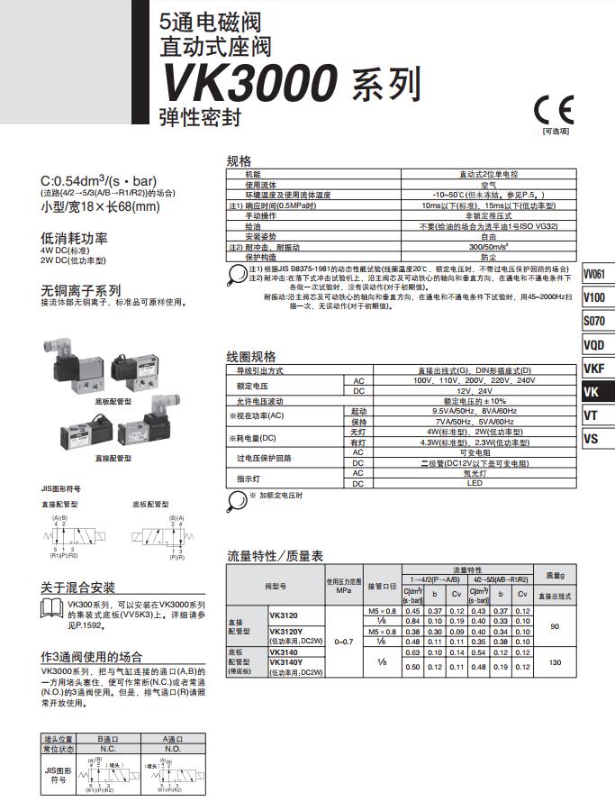 ・功率低(2W DC 低功率型)・0MPa的压力下即可使用。・可与VK300混合安装。・集装型号:VV3K3